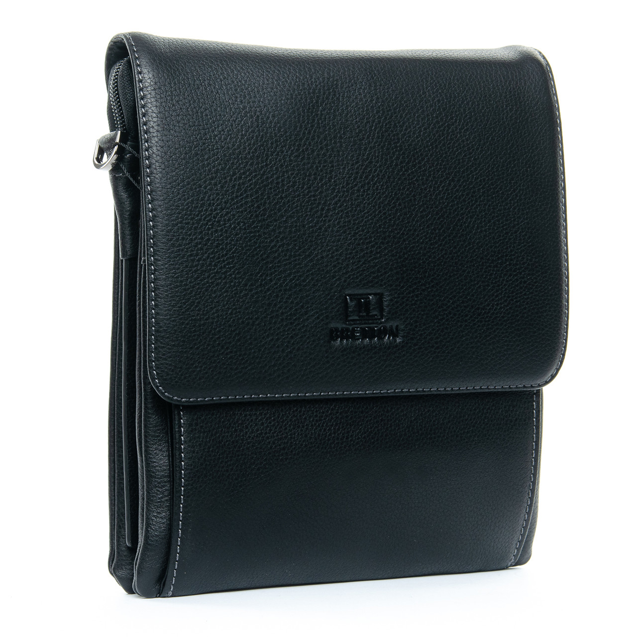 Чоловіча шкіряна сумка-планшет Bretton. Під клапаном додатково закривається на блискавку. Усередині розміщене подвійне відділення, розділене кишенею-перегородкою, відкрита кишеня й бічна кишеня на блискавці. На фасаді сумки під клапаном є дві відкриті кишені й одна кишеня на блискавці. На зворотному боці розташована кишеня на блискавці.